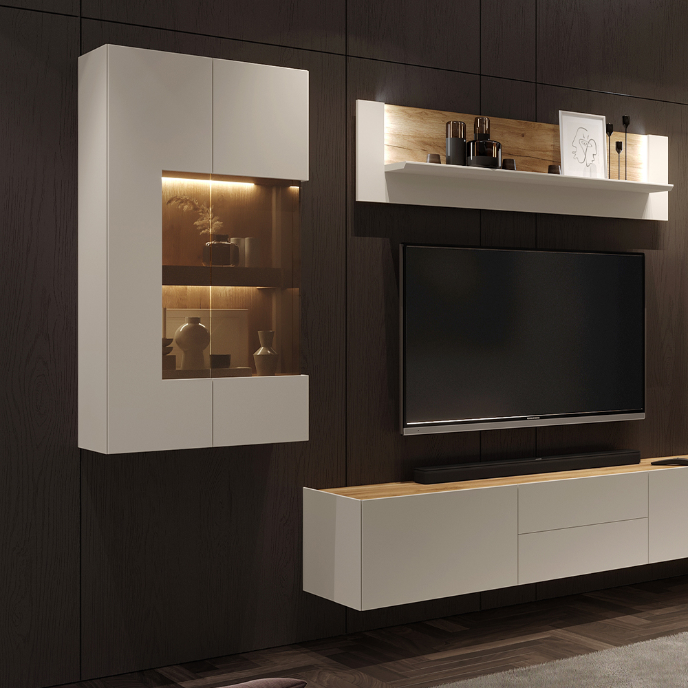- masivne police unutar elemenata sa skrivenom LED rasvetom i punim leđima u drvo-dekoru Tobacco hrast kao i parsol staklo u braon boji, daju ovoj vitrini jedinstveni izgled
