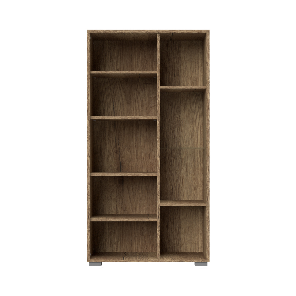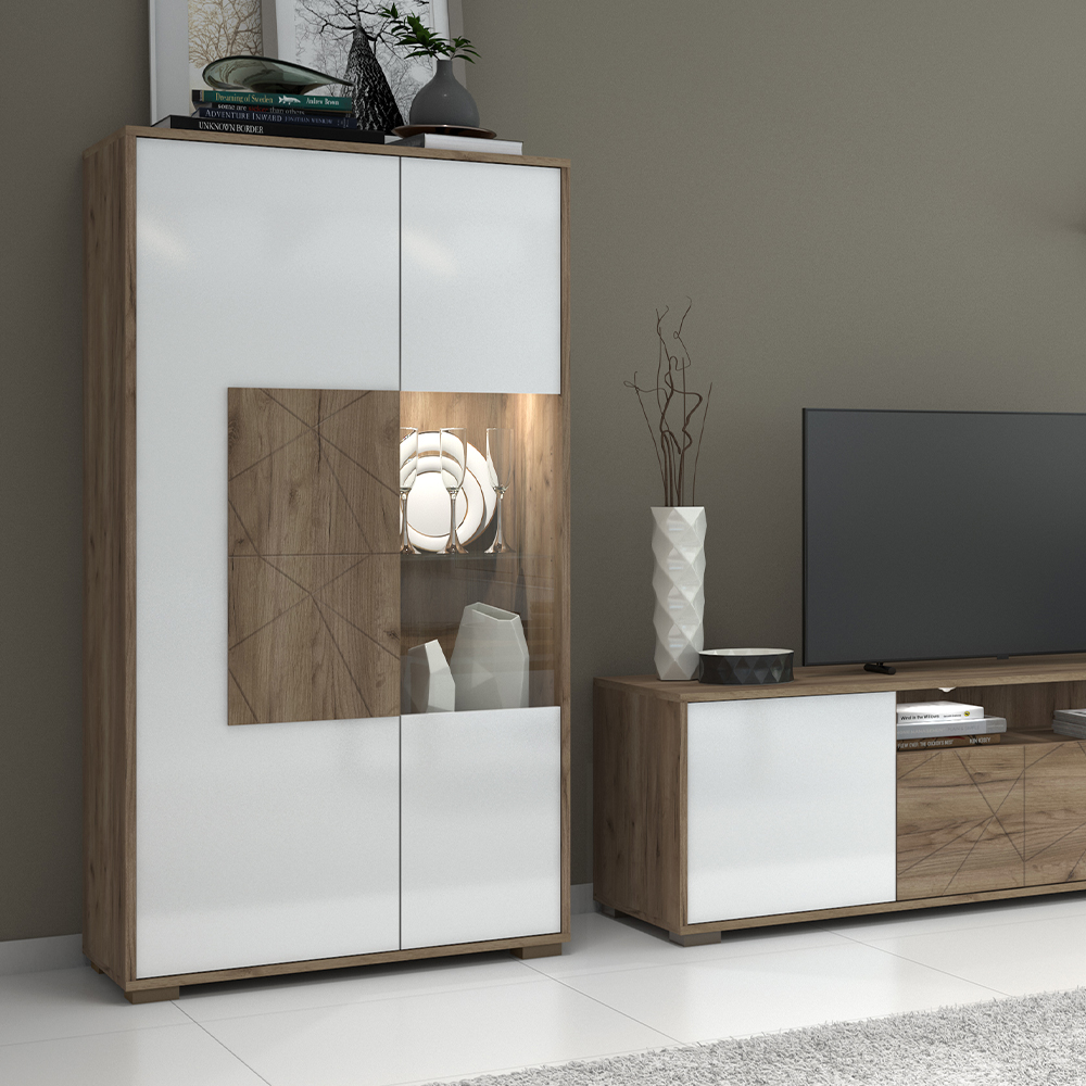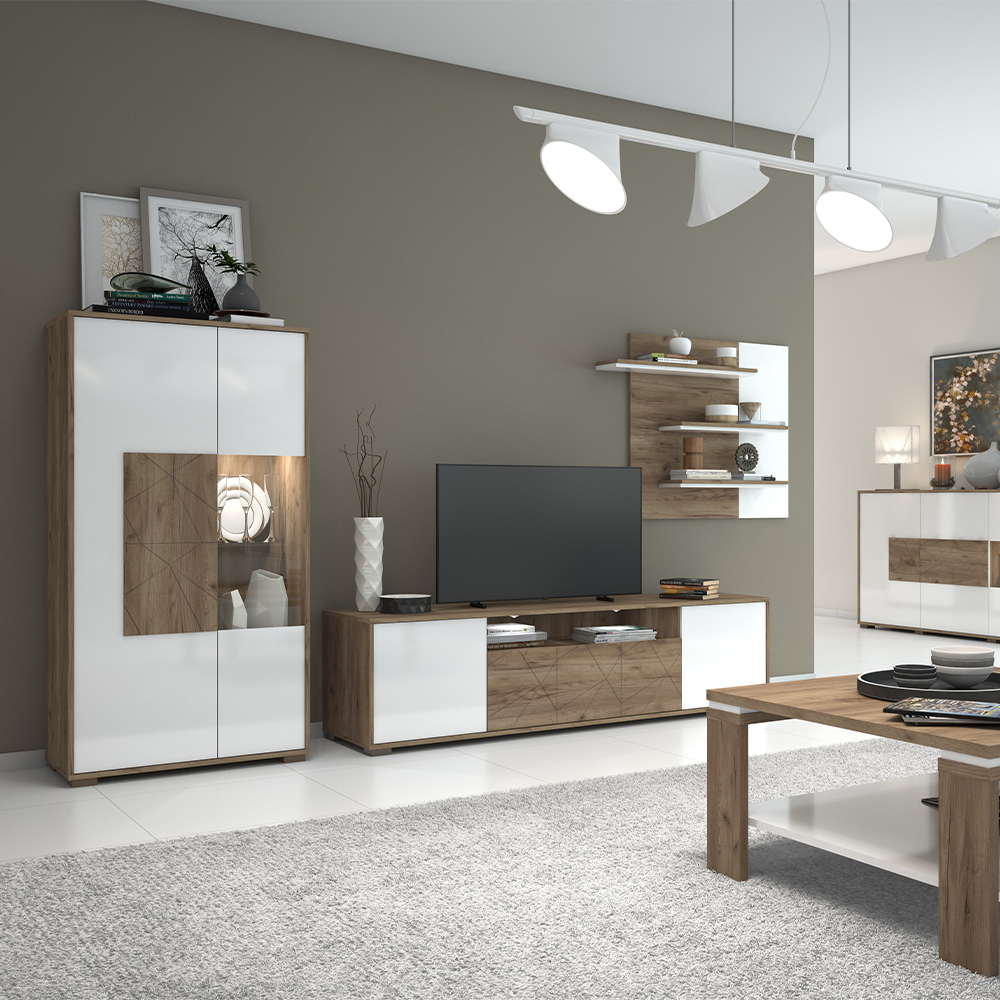 • vitrina ima četiri faha u drvo-dekoru Tobacco hrast, dva staklena faha, kao i podesive nožice za nivelisanje na neravnim površinama