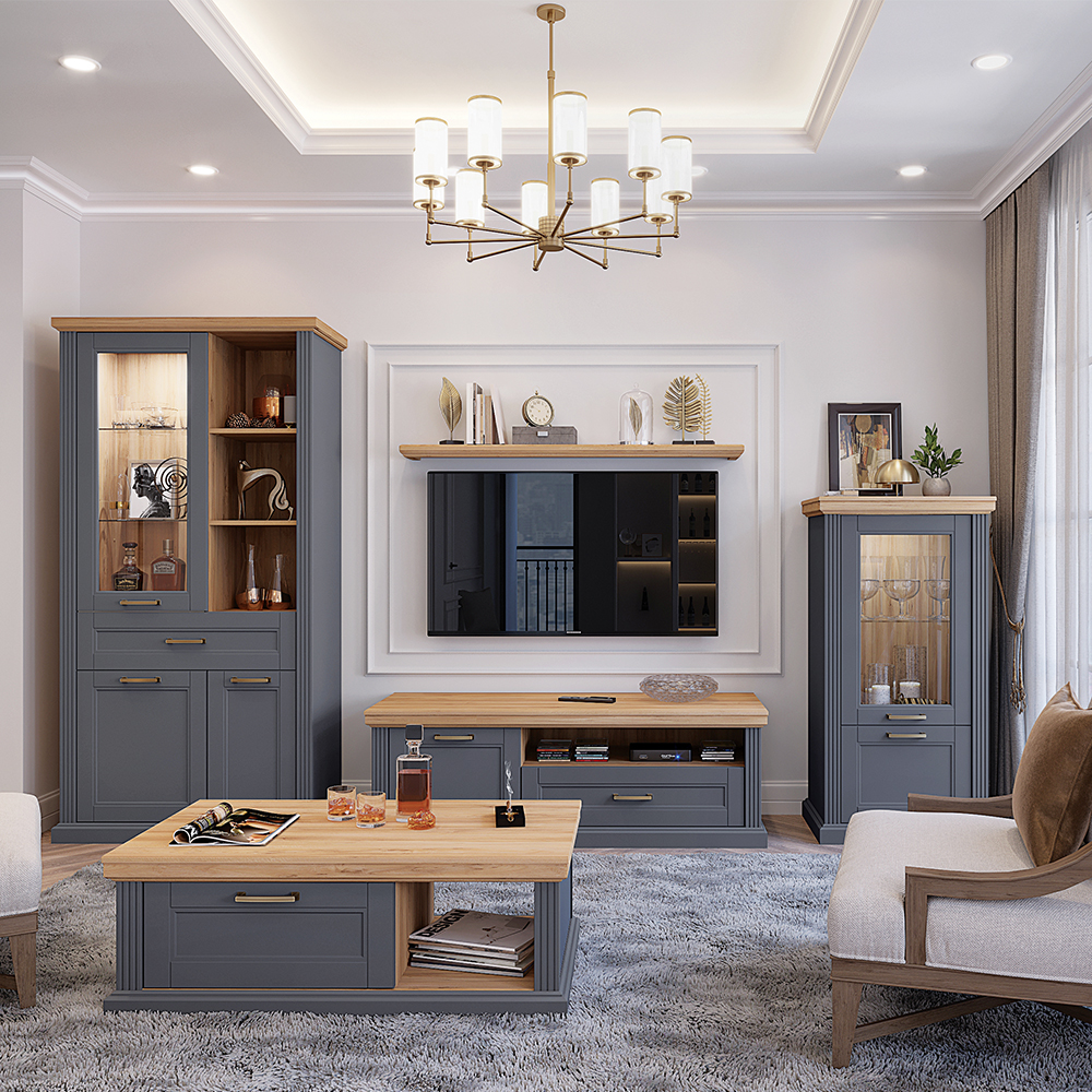 front vitrine je od rezbarenog medijapana lakiranog UV lakom sa soft mat efektom u grafit ili beloj boji, a dekorativna masivna pokrivna ploča od medijapana presvučena folijom u dekoru Pacifik orah