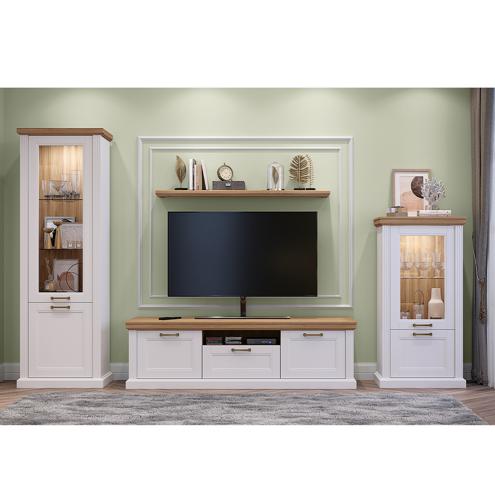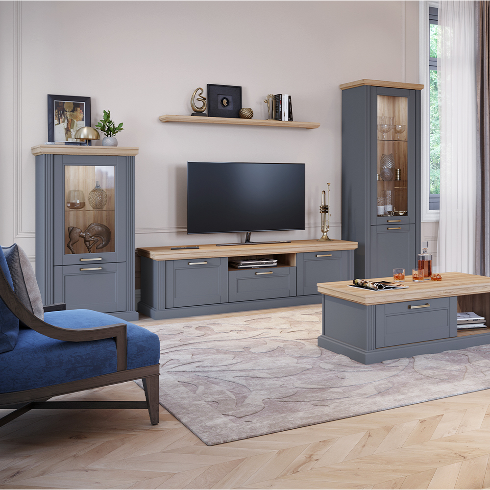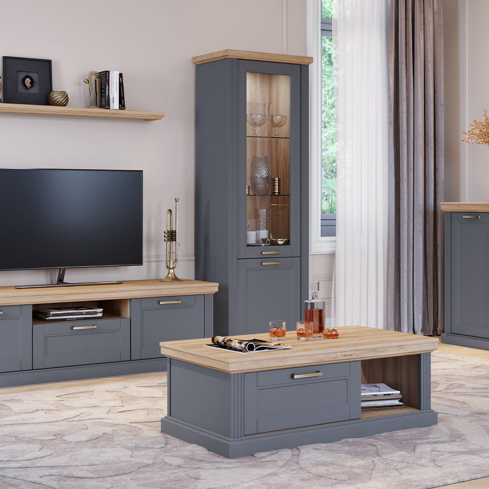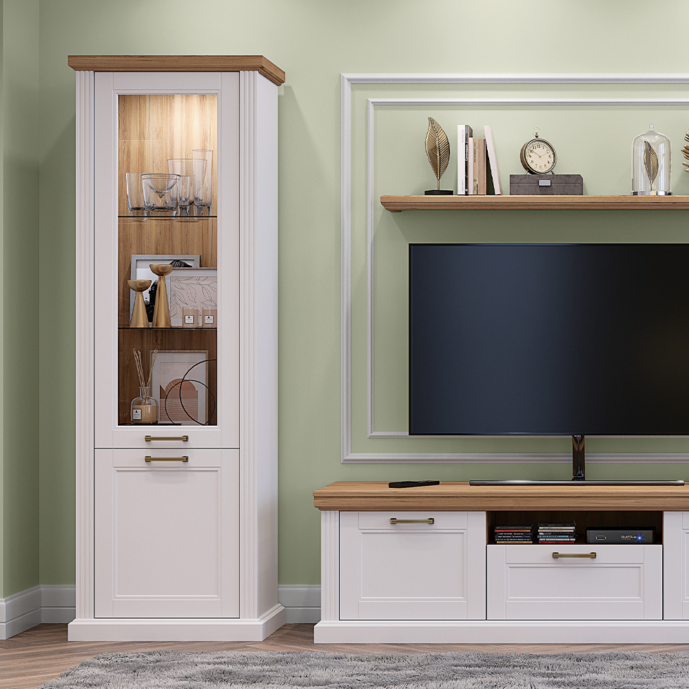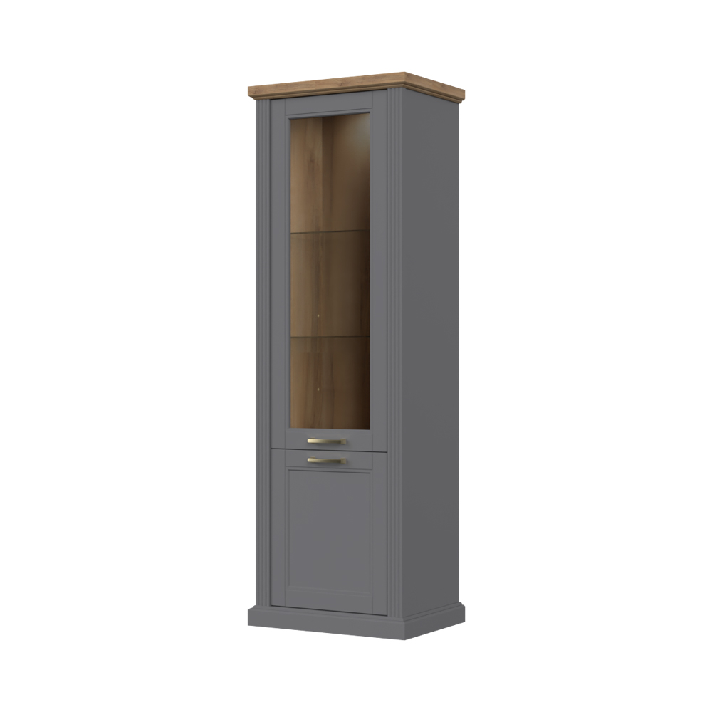Luksuzna vitrina za dnevni boravak iz kolekcije Tara sa jednim staklenim i jednim punim krilom.