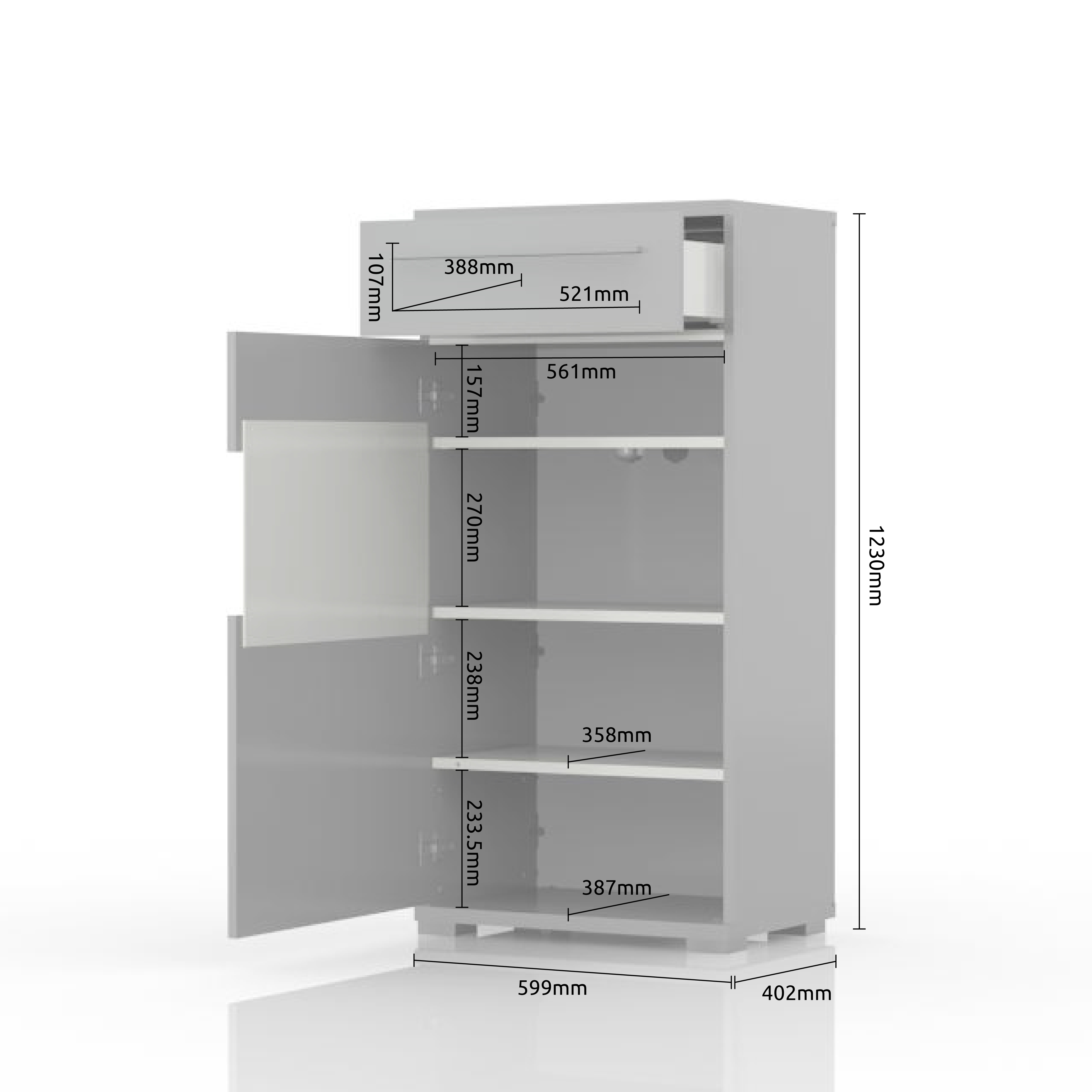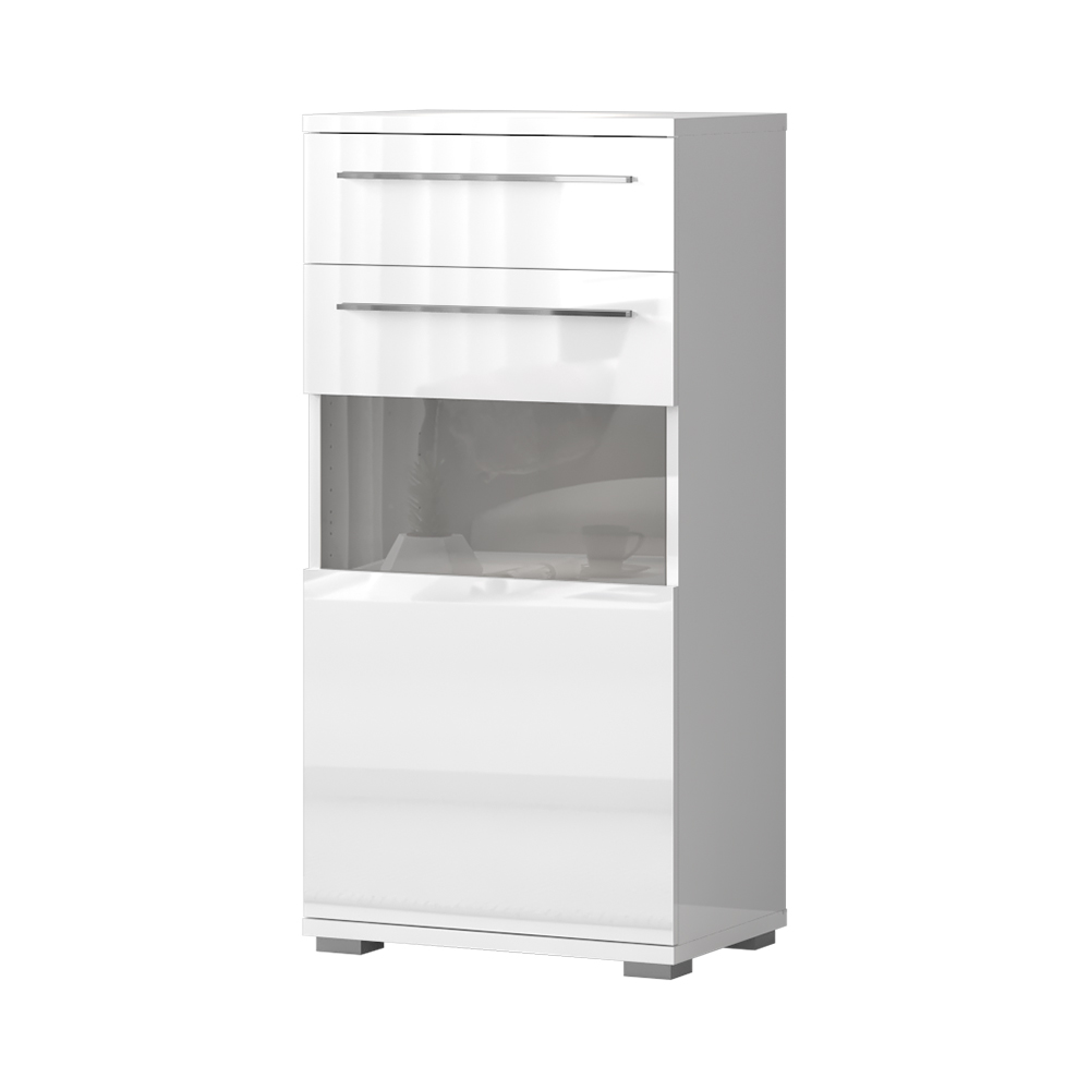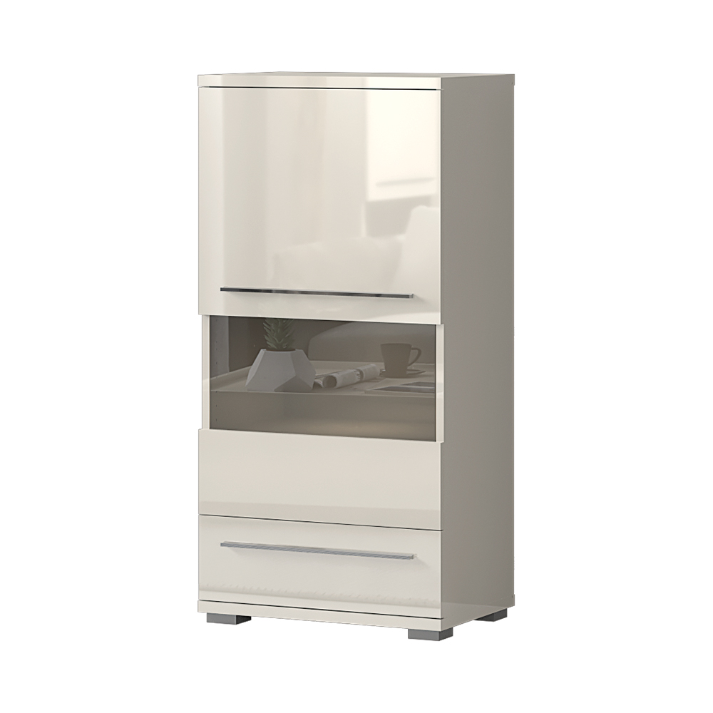 - Funkcionalna vitrina iz kolekcije nameštaja PIANO sa jednim staklenim krilom I jednom fiokom, dizajnirane geometrijske forme.