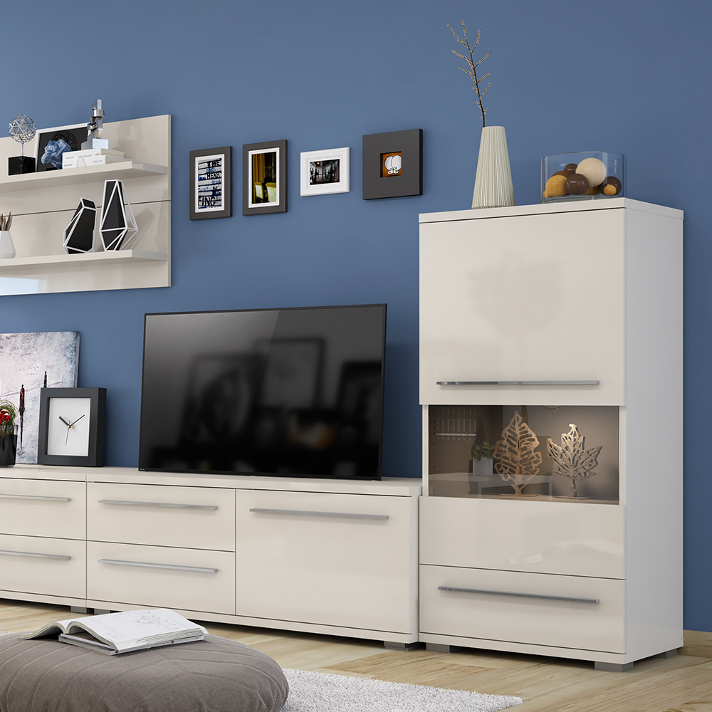 - frontovi, bočne strane i plafon elementa lakirani su UV lakom u visokom sjaju, u toploj bež ili beloj boji