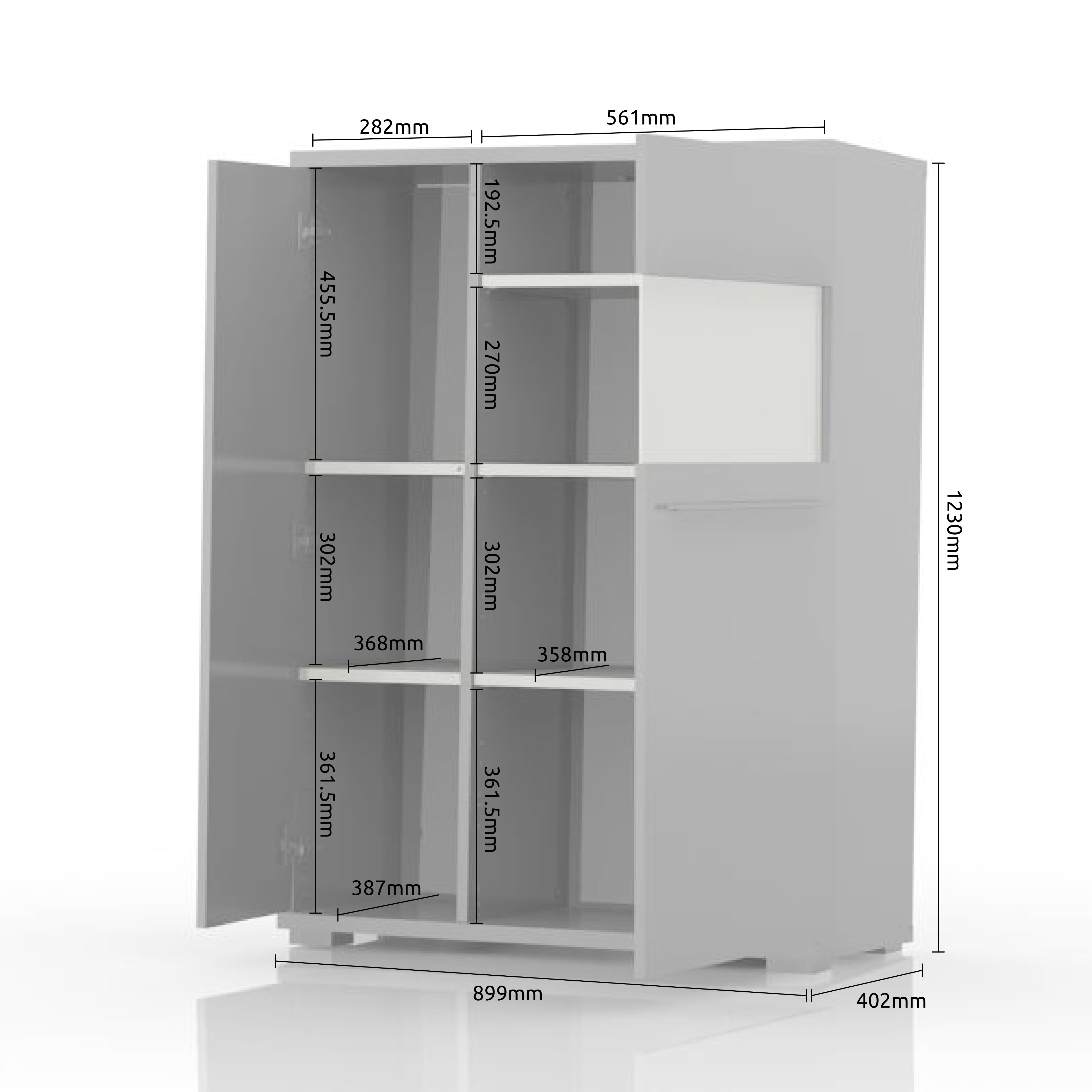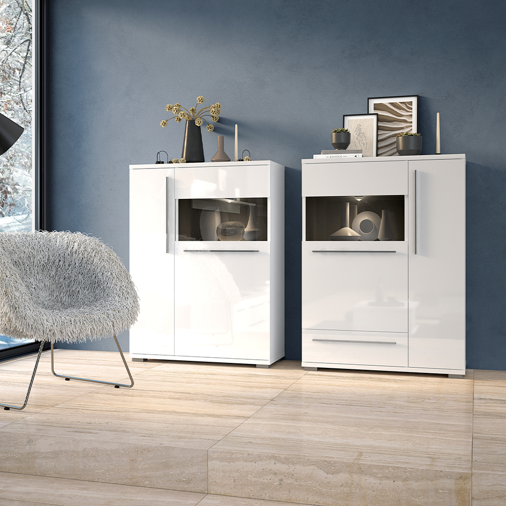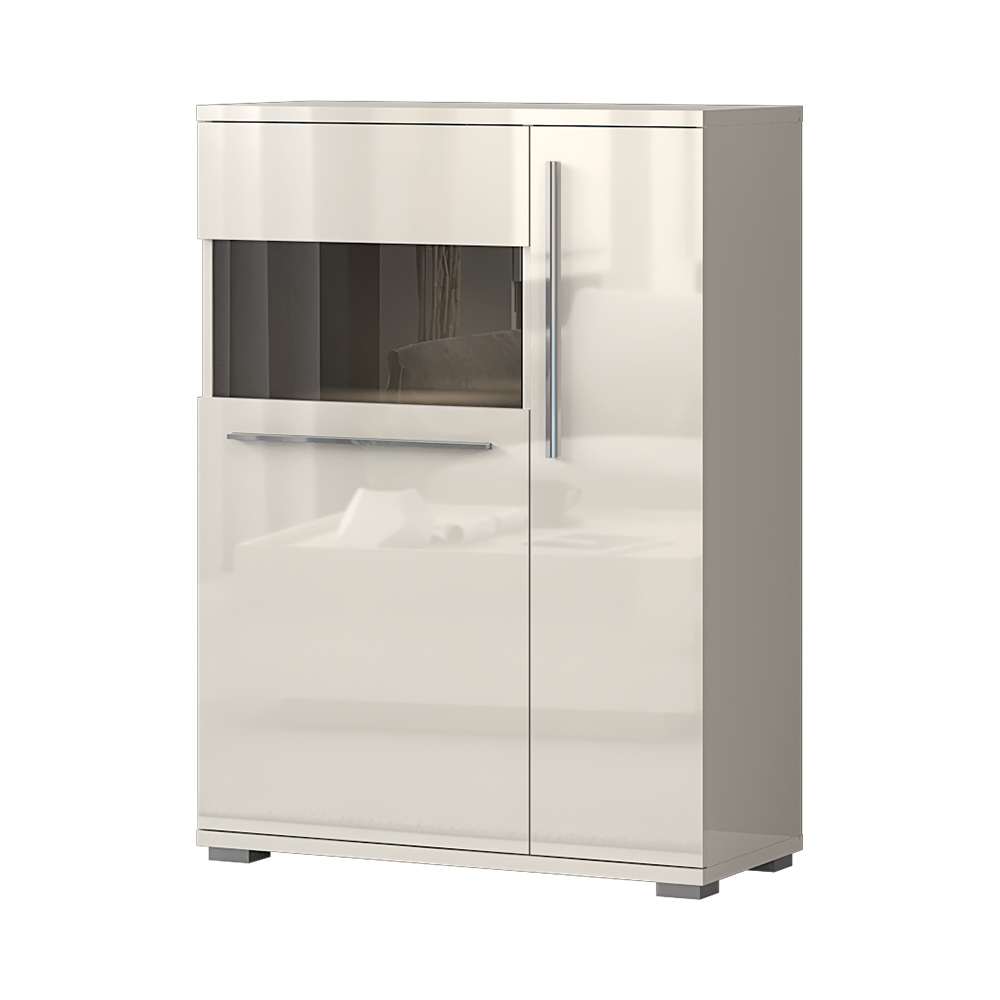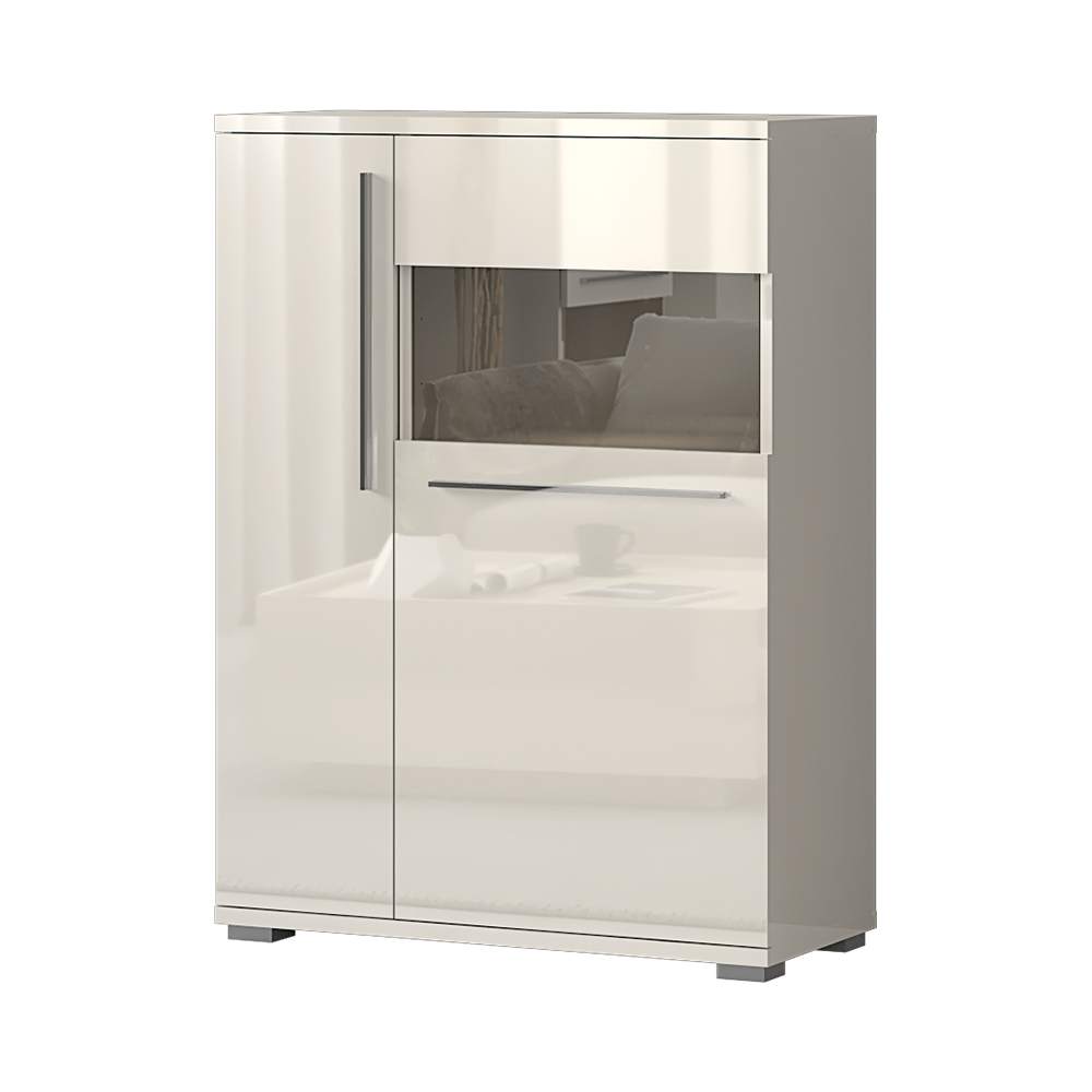 - Funkcionalna vitrina sa jednim punim krilom I jednim sa staklenim detaljem na višem nivou krila, dizajnirane geometrijske forme.