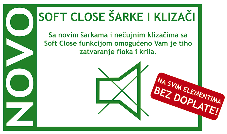Novo! Na svim elementima, bez doplate, Jela Jagodina d.o.o. omogućava Vam tiho zatvaranje fioka i krila. Soft Close šarke i klizači danas su dostupni kao standardna oprema svih naših elemenata.